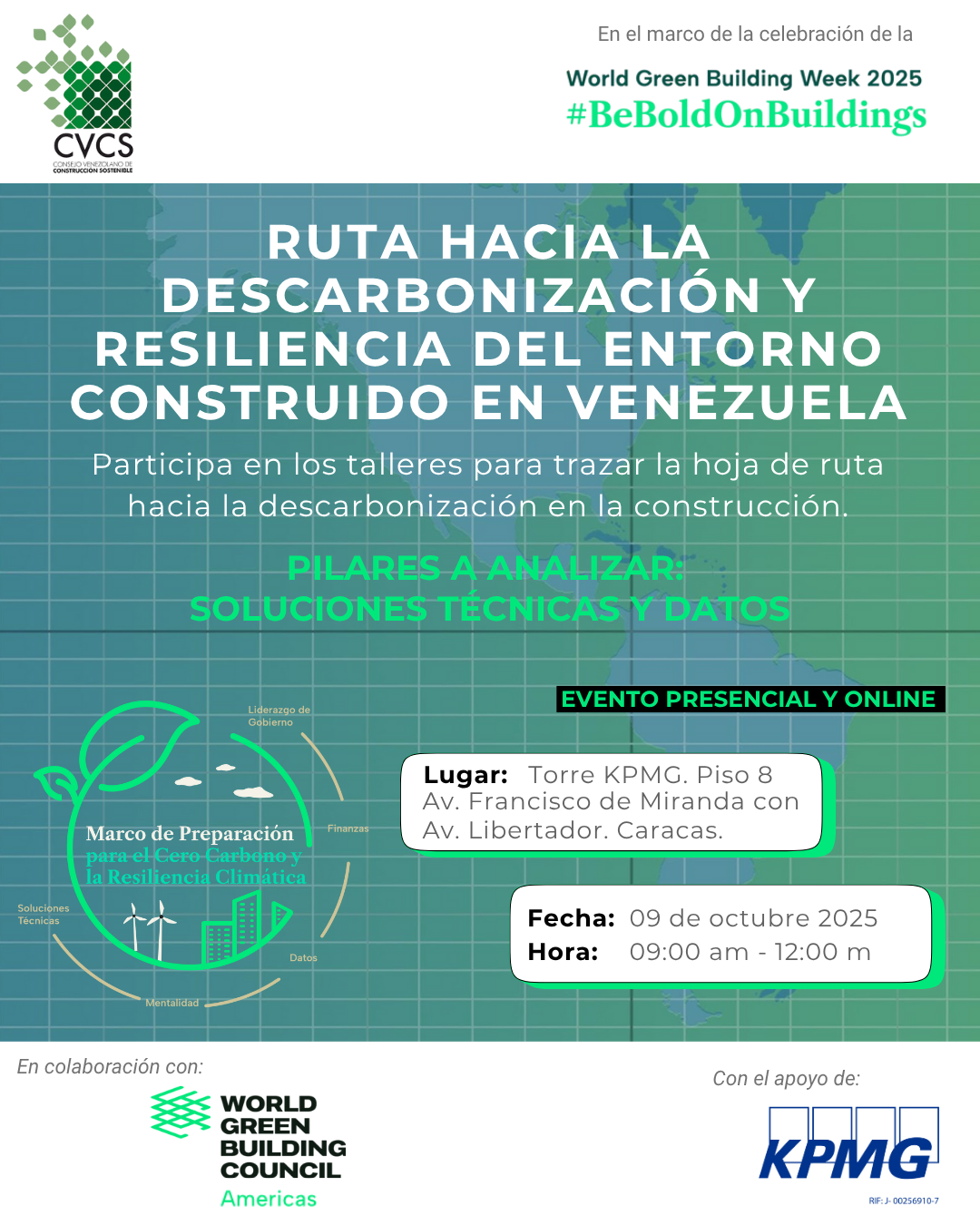 La World Green Building Week 2025, con sus llamado a ser audaces y atreverse a construir sostenible, bajo ese llamado el Consejo Venezolano de Construcción Sostenible desarrollará el primer taller que se requiere en el proyecto Marco de Preparación para el Cero Carbono y Resiliencia Climática ( Zero Carbon and Climate Resilience Readiness Framework ). Para conocer más respecto a los avances de este proyecto en Venezuela, recomendamos visitar los siguientes enlaces: Venezuela desea crear la hoja de ruta de descarbonización y Informe Etapa 1 para la creación de la hoja de ruta hacia la construcción sostenible en Venezuela